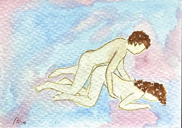 Original firmado por la autora Elsa Clauss. Postal realizada con materiales al agua sobre cartulina gruesa texturizada. Publicada en la obra Subversión Celeste