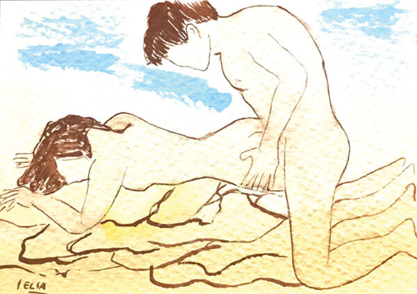 Original firmado por la autora Elsa Clauss. Postal realizada con materiales al agua sobre cartulina gruesa texturizada. Publicada en la obra Subversión Celeste