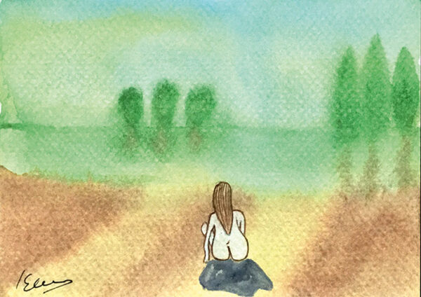 Original firmado por la autora Elsa Clauss. Postal realizada con materiales al agua sobre cartulina gruesa texturizada. Publicada en la obra Subversión Celeste