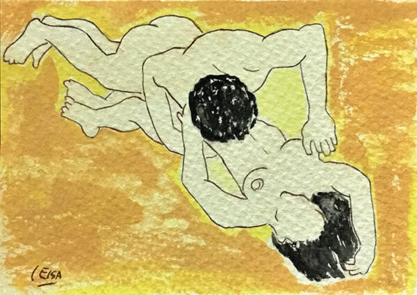 Original firmado por la autora Elsa Clauss. Postal realizada con materiales al agua sobre cartulina gruesa texturizada. Publicada en la obra Subversión Celeste